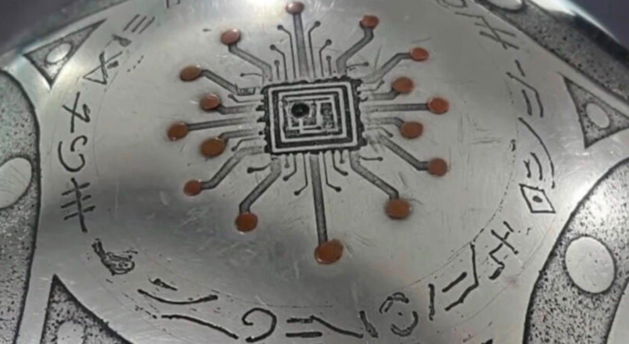 First, the symbols are all over the place. You’ve got ancient mysticism mixed with microchip designs. That central square with lines and dots looks exactly like a computer chip, something I’ve seen before in AI generated diagrams and technical blueprints. It’s not some secret alien language; it’s tech cliche wrapped in mystery.